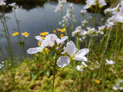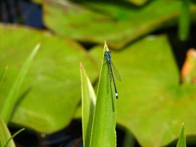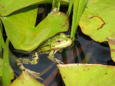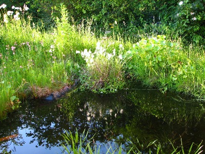 Der Folien-Gartenteich hat eine Wasseroberfläche von ca. 4 qm, eine maximale Tiefe von einem Meter und liegt in sonniger Lage. Das Teichprofil gliedert sich in drei Bereiche: Tiefwasser, Flachwasser und Sumpfzone, die wir mit heimischer Flora bepflanzt haben. In unserem Teich haben sich Gelbrandkäfer, Rückenschwimmer, Wasserläufer, verschiedene Libellenarten, Wasserfrösche und sogar Teich-Molche von selbst angesiedelt. Auf einen Fischbesatz haben wir verzichtet, da es dabei nicht diese Artenvielfalt gäbe. Die Frösche geben im Frühling Tag und Nacht ein ordentliches Konzert. Wir haben gottseidank tolerante und naturverbundene Nachbarn. Leider holen sich die Katzen aus der Nachbarschaft manchmal einen Frosch.