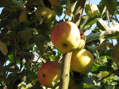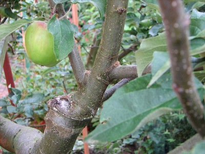 Hier haben wir auf einen Ontario-Apfel die Sorte "Geheimrat Dr. Oldenburg" aufgepfropft