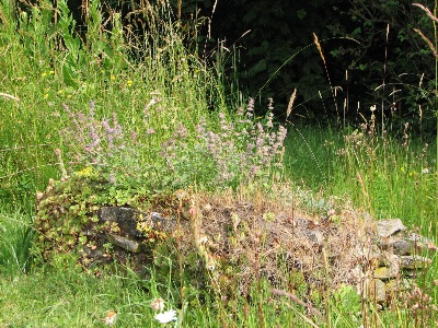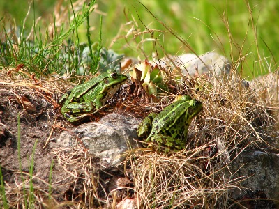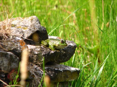 Die Trockenmauer liegt ganz nahe am Gartenteich. Wenn im Hochsommer die Ameisen ausfliegen, klettern die Frösche auf die Mauer und schnappen nach ihnen.