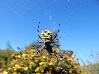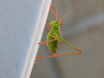 Die "Punktierte Zartschrecke" lebt normalerweise in Sträuchern und Gebüschen. Nachdem wir unseren Brombeerstrauch nach der Ernte zurückgeschnitten hatten, haben wir dieses Exemplar am Gartentisch entdeckt.